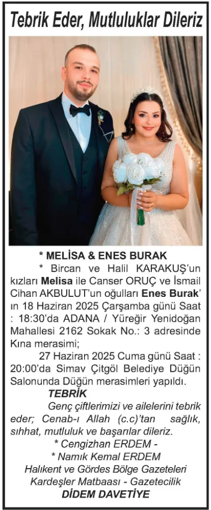 * Maşallah ve Çure ERİM'in kızları Rukiye ile Menice ve Şükrü AVCI'nın oğulları Deniz'in 28 Haziran 2025 Cumartesi günü Saat : 18:00'da Alaşehir Kavaklıdere Mahallesi İstasyon Meydanı Tren Garı yanı adresinde Düğün merasimleri yapıldı.