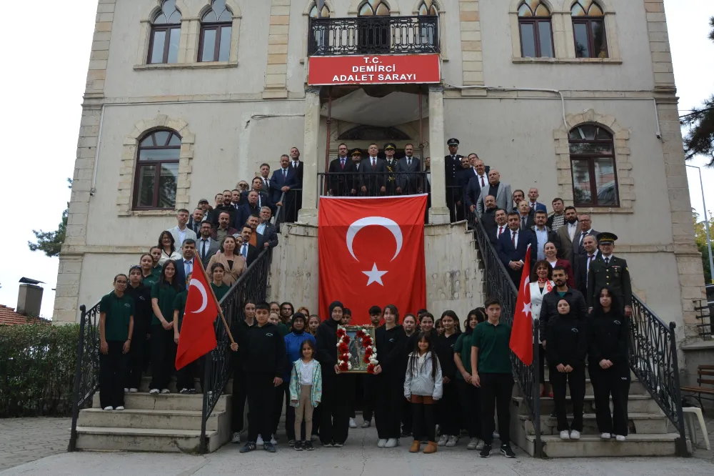 Kurtuluş Savaşında Milli Mücadele Kahramanı De- mirci Kaymakamı İbrahim Ethem AKINCI tarafından karargâh olarak kullanılan tarihi hükümet konağı 1928 yılı Cumhuriyet Bayramında çekilen bayram fotoğrafı 97 yıl sonra Cumhuriyet’in 102. yılında taçlandırıldı.