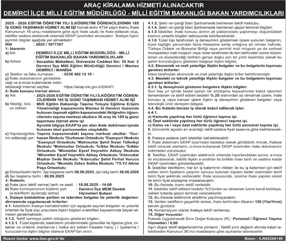 ARAÇ KİRALAMA HİZMETİ ALINACAKTIR DEMİRCİ İLÇE MİLLİ EĞİTİM MÜDÜRLÜĞÜ - MİLLİ EĞİTİM BAKANLIĞI BAKAN YARDIMCILIKLARI