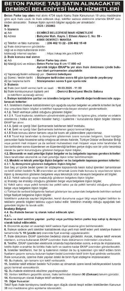 Beton Parke taşı alımı mal alımı 4734 sayılı Kamu İhale Kanununun 19 uncu maddesine göre açık ihale usulü ile ihale edilecek olup, teklifler sadece elektronik ortamda EKAP üzerinden alınacaktır. İhaleye ilişkin ayrıntılı bilgiler aşağıda yer almaktadır: