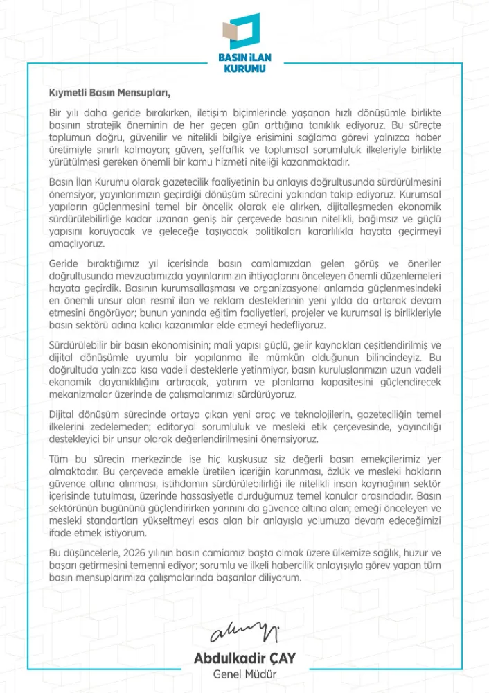 Basın İlan Kurumu Genel Müdürü Abdulkadir ÇAY, yeni yıl münasebetiyle yayımladığı mesajında, basın çalışanlarına güzel bir yıl geçirmeleri temennisinde bulunarak, sektöre ilişkin beklenti ve değerlendirmelerini kamuoyuyla paylaştı.
