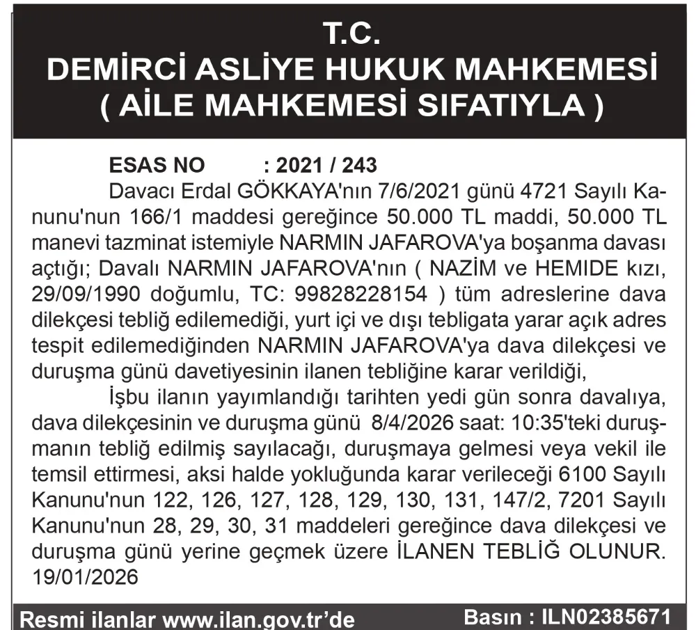 T.C. DEMİRCİ ASLİYE HUKUK MAHKEMESİ ( AİLE MAHKEMESİ SIFATIYLA )