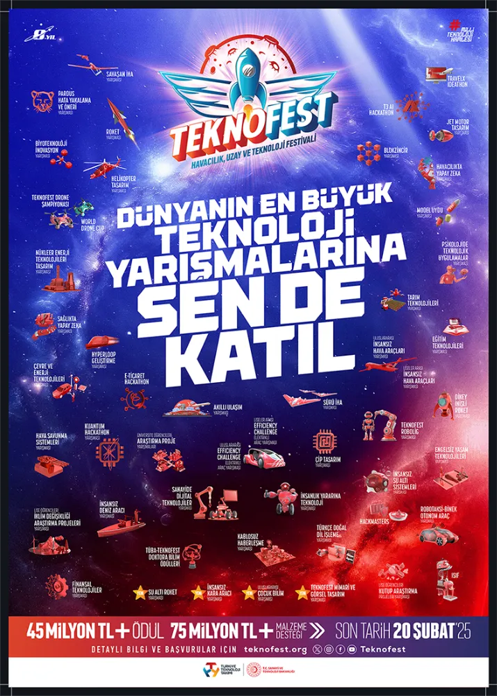 2024 Teknoloji Yarışmaları’ndan farklı olarak TEKNOFEST 2025 kapsamında Su Altı Roket Yarışması, İnsansız Kara Aracı Yarışması, Uluslararası Çocuk Bilim Yarışması ve TEKNOFEST Mimari ve Görsel Tasarım Yarışması ise ilk defa başvuruya açılacak. İlkokul seviyesinden ortaokul, lise, üniversite, lisansüstü ve mezun seviyesine kadar başvurulabilen, tamamı geleceğin odak alanlarında kurgulanmış yarışmalar hak-kında detaylı bilgi sahibi olmak ve başvurunuzu gerçekleştirmek için www.teknofest.org adresini ziyaret edebilirsiniz.
