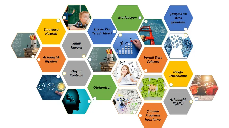 1. Eğitsel Rehberlik : Çocuğunuzun okul başarısını artırmaya yöneliktir. Verimli ders çalışma teknikleri, sınav kaygısı, zaman yönetimi ve üst öğrenime geçiş sınavları bu kapsamdadır.