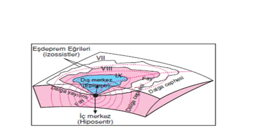 Deprem, litosferin yüzeye yakın kısımlarda meydana gelirse bunlara sığ depremler, 60 - 70 km lerde meydana gelirse derin depremler denir. Derin dep remler çok geniş alanlarda his-sedilir, buna karşılık yaptıkları hasar azdır. Sığ depremler ise dar bir alanda hissedilirken bu alan içinde çok büyük hasar yapabilirler. Depremin oluştuğu yeraltı iç merkez, onu karşılayan üst kısım ise dış merkez olarak ifade edililir ( Şekil 2 ).