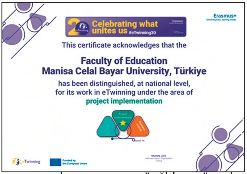MCBÜ Demirci Eğitim Fakültemiz, Avrupa Komisyonu tarafından yürütülen ve Türkiye’de Millî Eğitim Bakanlığı tarafından desteklenen “eTwinning Initial Teacher Education (ITE)” sürecinde, uluslararası proje uygulamaları kategorisinde tam puan alarak “Ulusal Kalite Etiketi Belgesi” ile ödüllendirildi.
