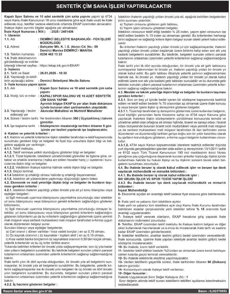 SENTETİK ÇİM SAHA İŞLERİ YAPTIRILACAKTIR