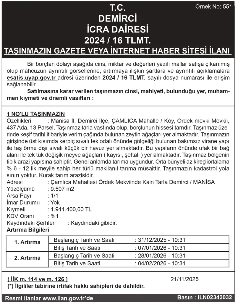 T.C. DEMİRCİ İCRA DAİRESİ 2024 / 16 TLMT. TAŞINMAZIN GAZETE VEYA İNTERNET HABER SİTESİ İLANI