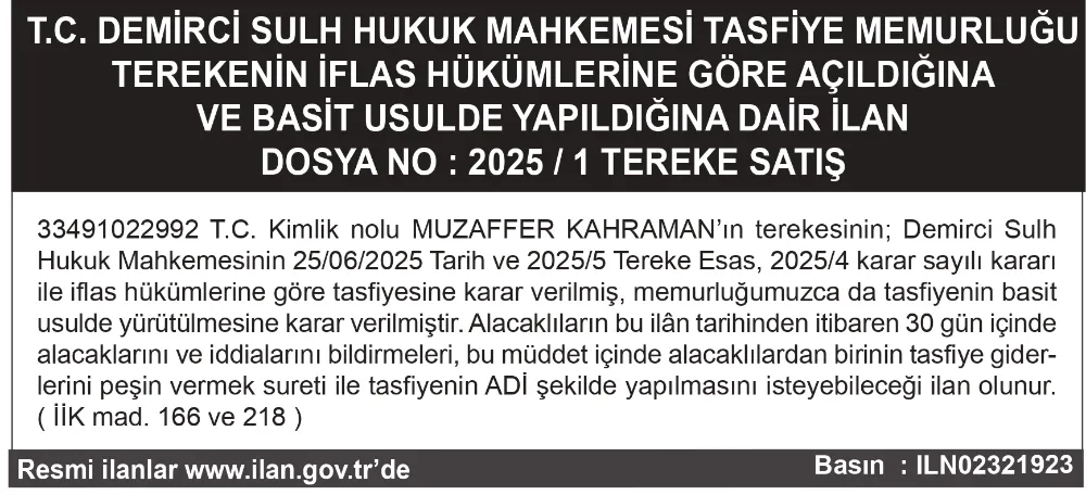 T.C. DEMİRCİ SULH HUKUK MAHKEMESİ TASFİYE MEMURLUĞU TEREKENİN İFLAS HÜKÜMLERİNE GÖRE AÇILDIĞINA VE BASİT USULDE YAPILDIĞINA DAİR İLAN DOSYA NO : 2025 / 1 TEREKE SATIŞ