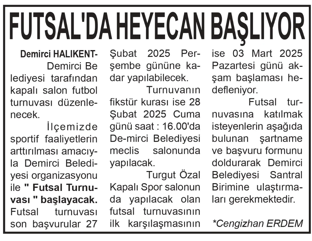 İlçemizde sportif faaliyetlerin arttırılması amacıyla Demirci Belediyesi organizasyonu ile " Futsal Turnuvası " başlayacak.