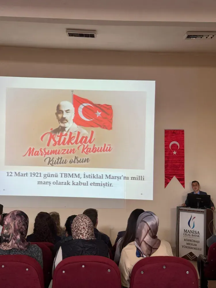 Manisa Celal Bayar Üniversitesi Köprübaşı Meslek Yüksekokulu’nda 12 Mart 2026 tarihinde “12 Mart İstiklâl Marşı’nın Kabulü ve Mehmet Akif Ersoy’u Anma Günü” etkinliği düzenlendi.