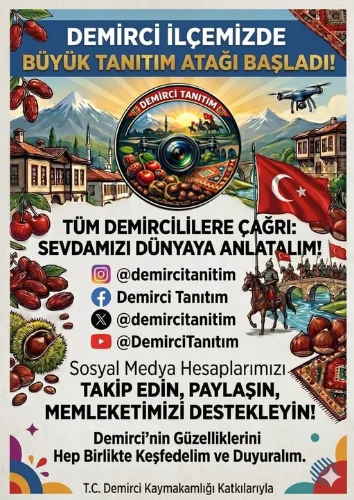 Demirci’nin sahip olduğu doğal, kültürel ve tarihî değerlerin daha geniş kitlelere ulaştırılması amacıyla başlatılan tanıtım faaliyetlerimiz kapsamında “Demirci Tanıtım” sosyal medya hesaplarımız 15 Nisan 2026 tarihi itibariyle aktif olarak hizmet verecektir.