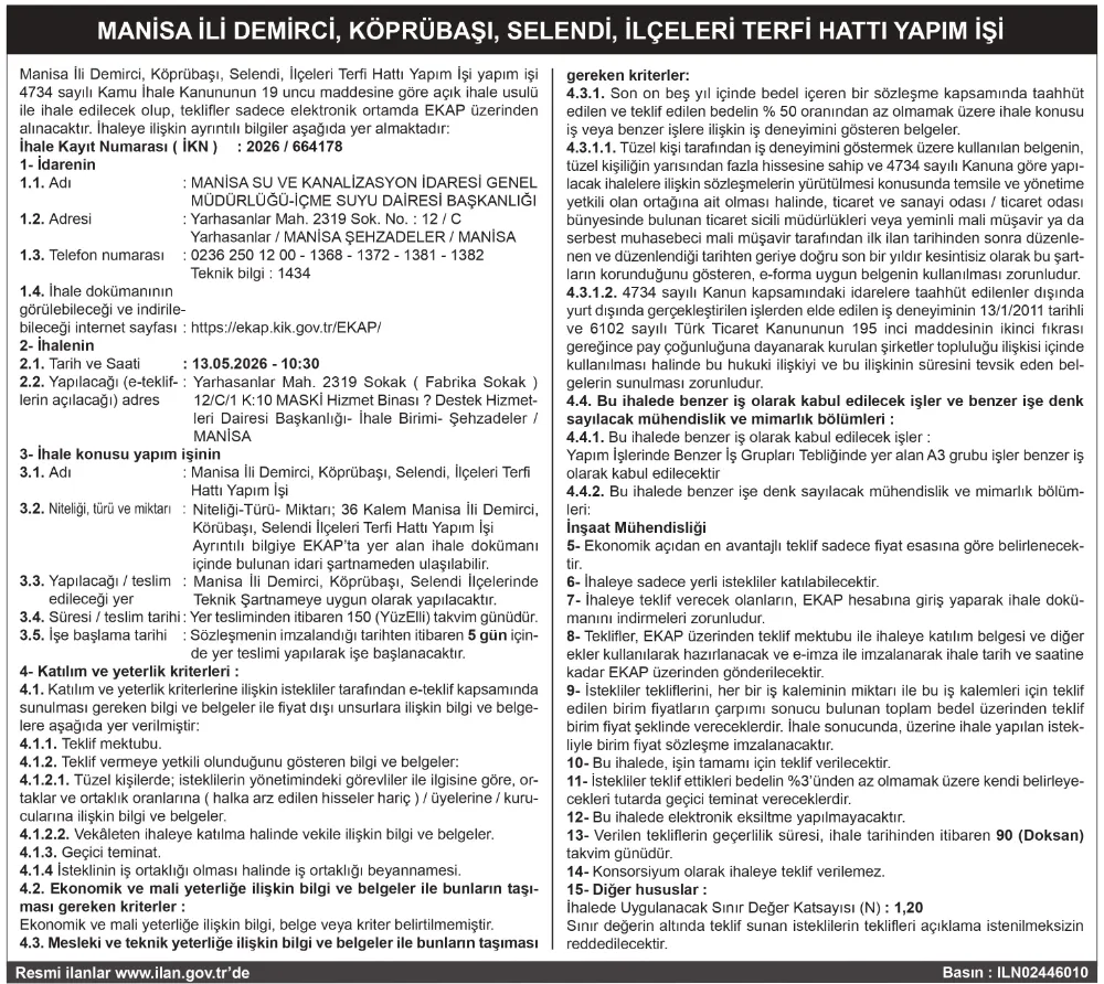 MANİSA İLİ DEMİRCİ, KÖPRÜBAŞI, SELENDİ, İLÇELERİ TERFİ HATTI YAPIM İŞİ