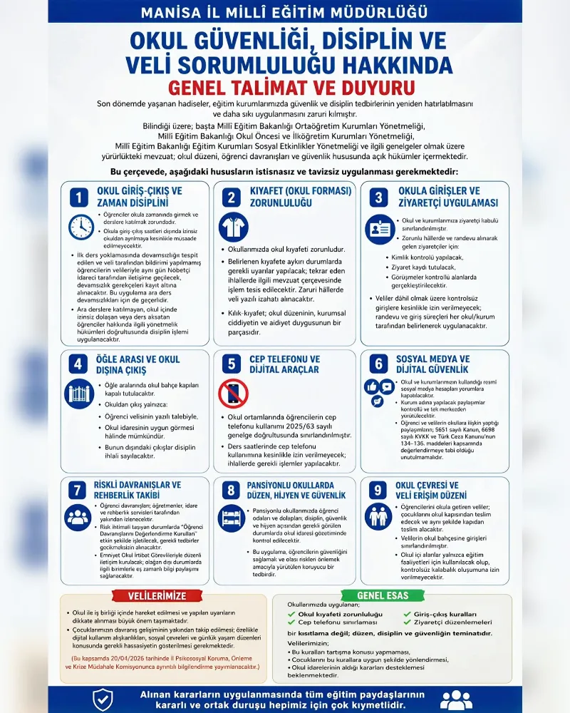 Okul kıyafeti, cep telefonu sınırlaması, giriş-çıkış ve ziyaretçi kuralları bir kısıtlama değil; düzen, disiplin ve güvenliğin teminatıdır.